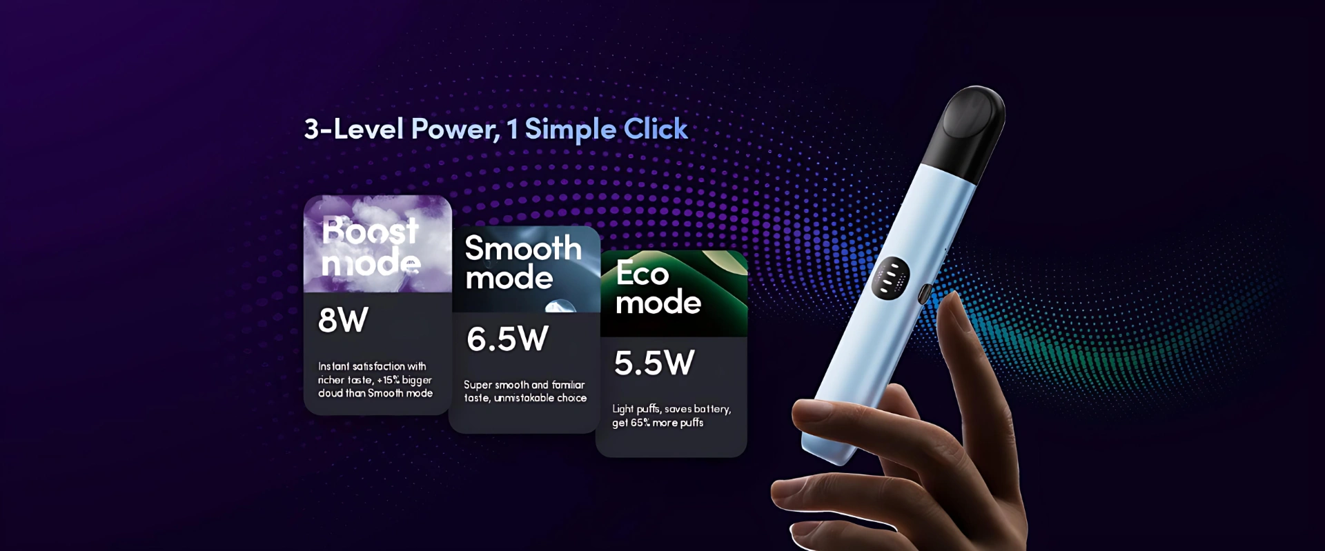 • Eco 模式(節能): 輸出功率較低,風味柔和,延長電池續航。